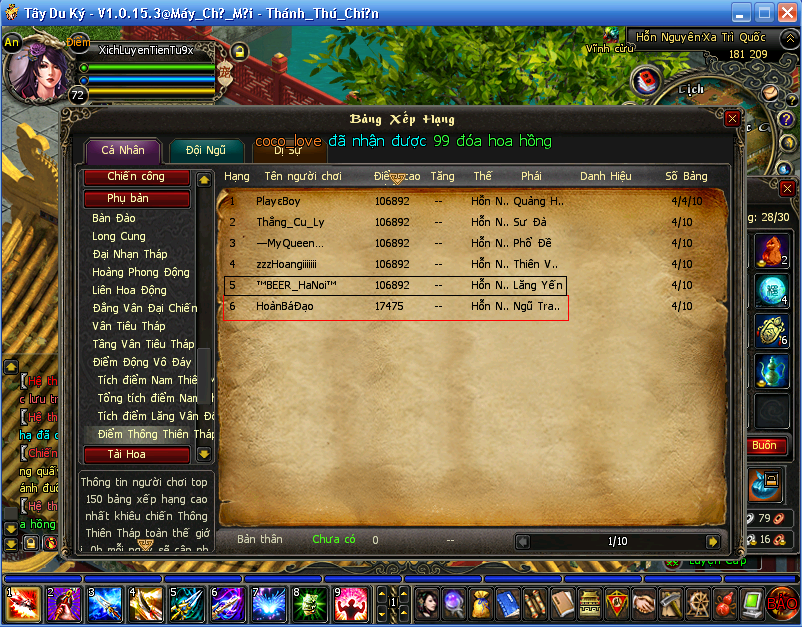 và theo như các bạn đã thấy trên hình ảnh tôi có tô đỏ 1 cái tên là " HoànBáĐạo " theo như tôi đã thấy thì nhân vật này đã có sự nghi ngờ về TEAM đi PB của mình khi vượt qua VTT tầng 50 ( ở đây tôi ko biết là đi trong bao lâu , có thể 15 cũng có thể 30p nhưng cũng có thể là 1 tiếng . ) khi 1 tổ đội khác lại được hình thành để thử đi TTT : 1 cảm giác rất mới lạ vì đây là PB cực khó cần 1 số Toái phiến LB mới vào dc TTT nhưng họ đã qua VTT và nhặt dc những vật phẩm vô cùng có giá trị để trải qua pb mới . Nên HoànBáĐạo chắc là cũng đã đoán già đoán non là có vấn đề ở đây nên chỉ đi dc 1 đoạn biết là có gì đó mờ ám nên đã out khỏi pt và điểm số TTT thấp hơn những người cùng đi còn lại.